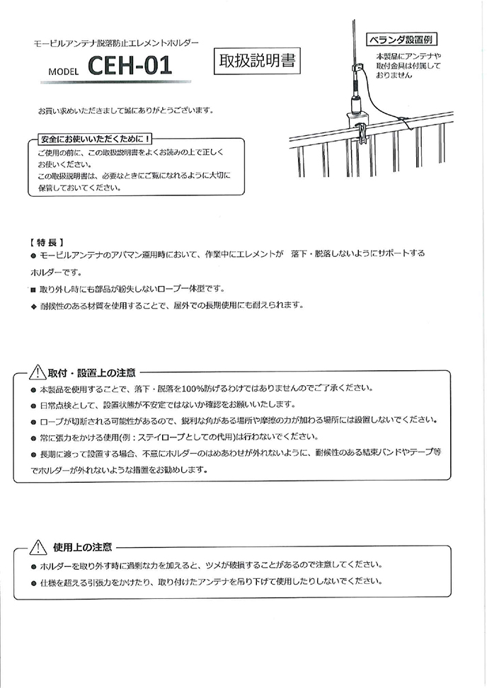 アパマンなので安全第一。とにかくベランダからホイップアンテナを突き出すときは必ず使用してます。もう少しロープが長ければダイヤモンド製センターローディングアンテナにも使用しやすいと思います。