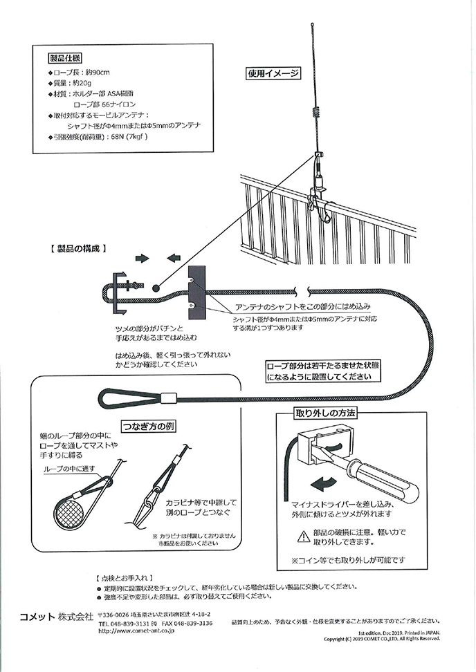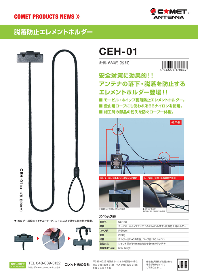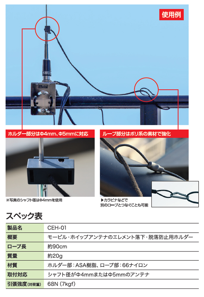 CEH-01 モービルアンテナエレメント脱落防止ホルダー【ゆ】(CEH01)最近、想定外の暴風雨がやってきたりしますから、出来る準備はしておきたいですね。まさかの時に一つあった方がよいかも。高いものではないですし…………。