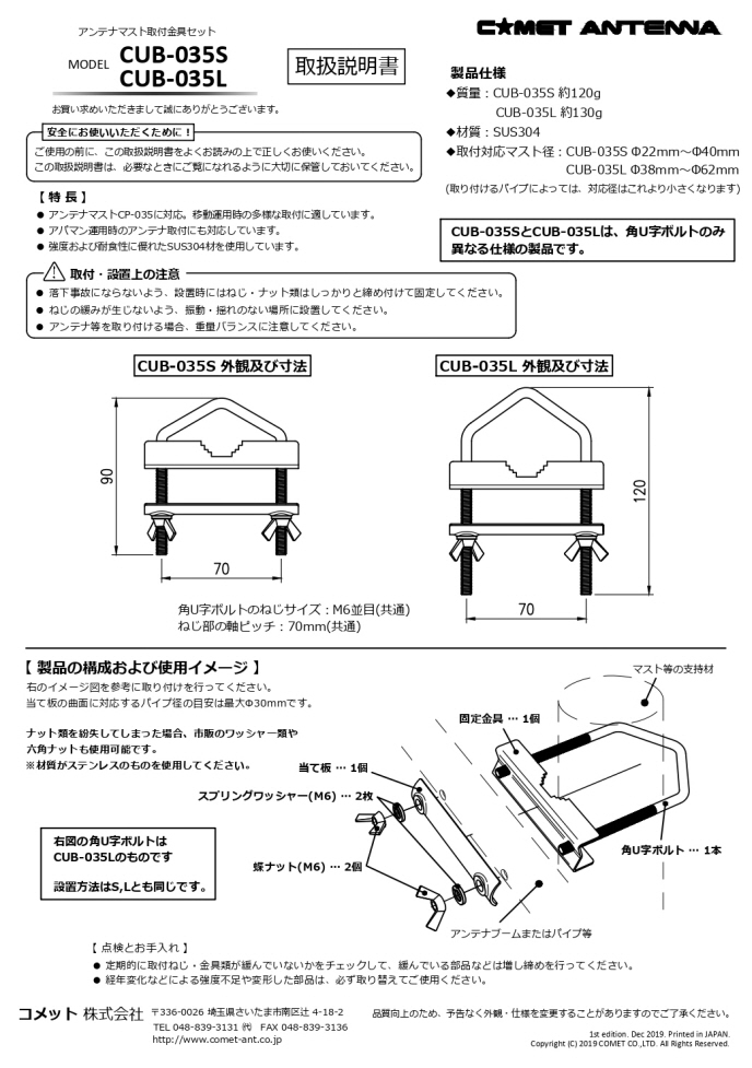 ※CUB-035SとCUB-035Lは、角U字ボルトのみ