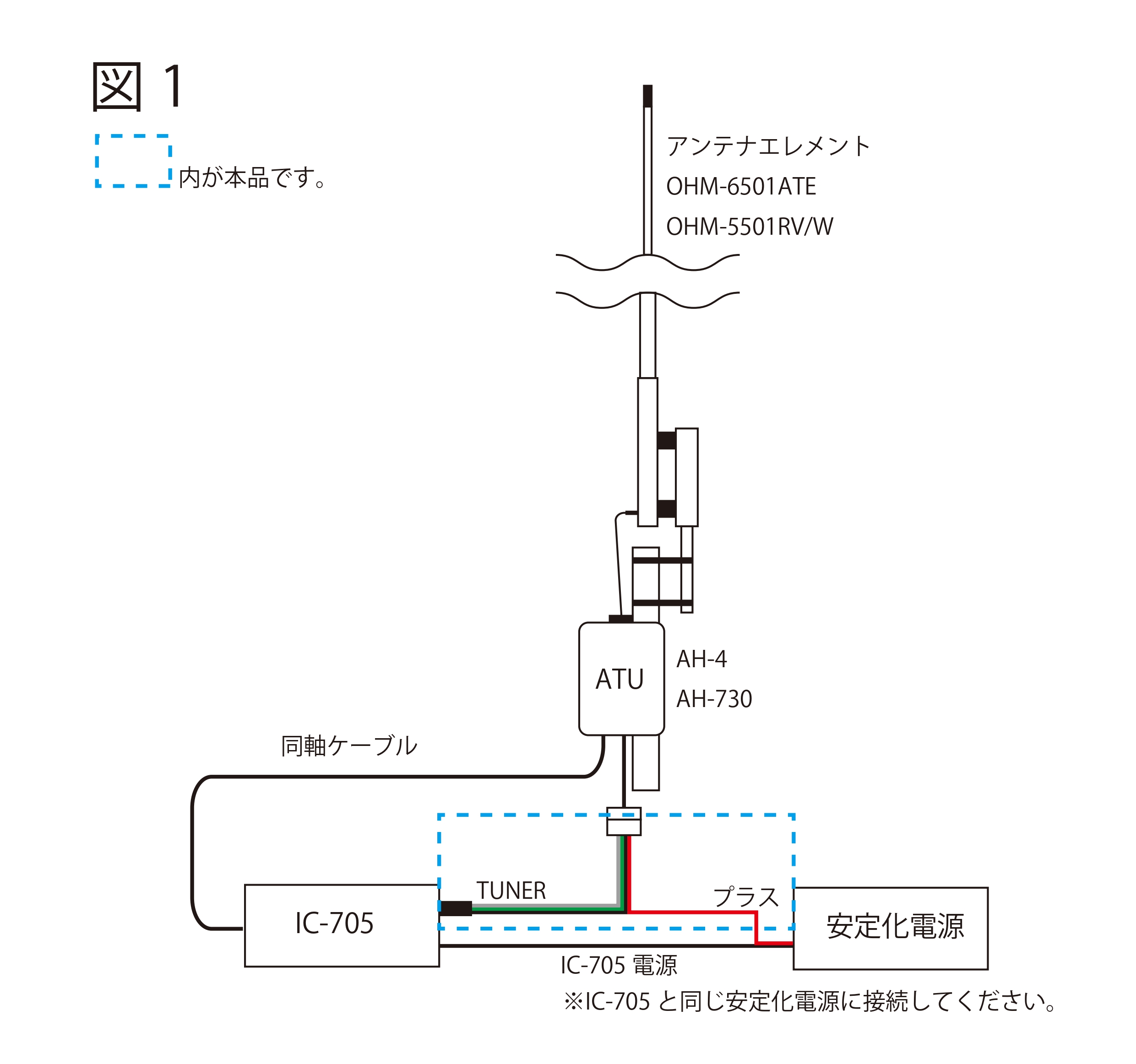1.電源をOFFにしたIC-705とオートアンテナチューナー(AH4/AH-730)を本品と接続します。図1参照