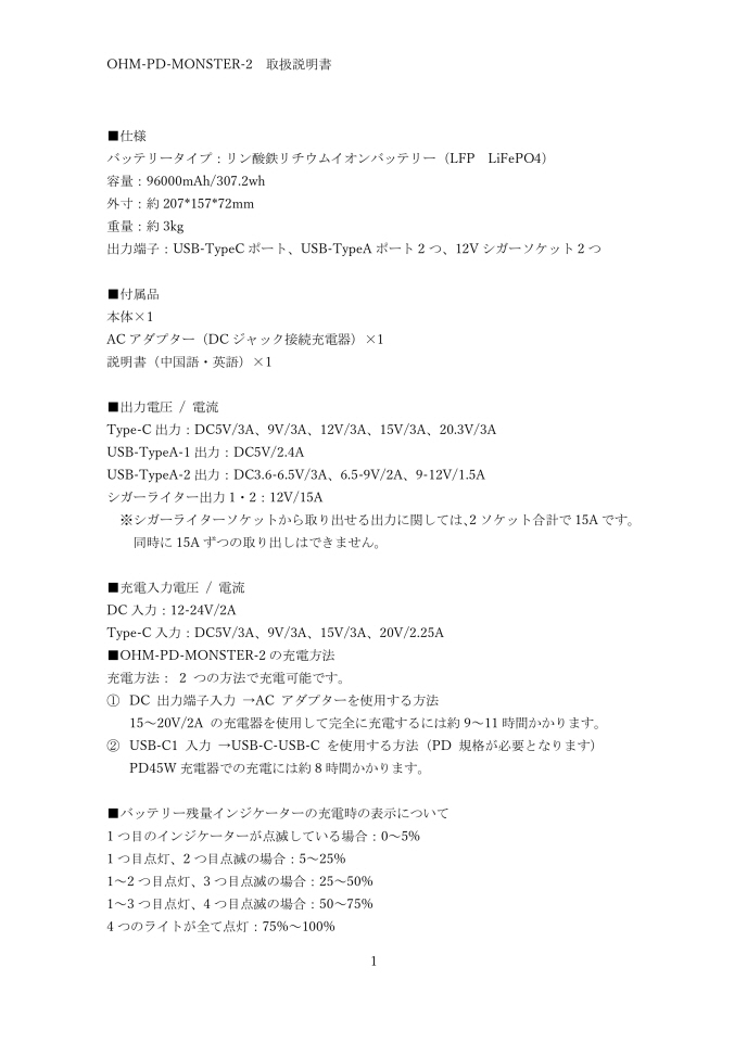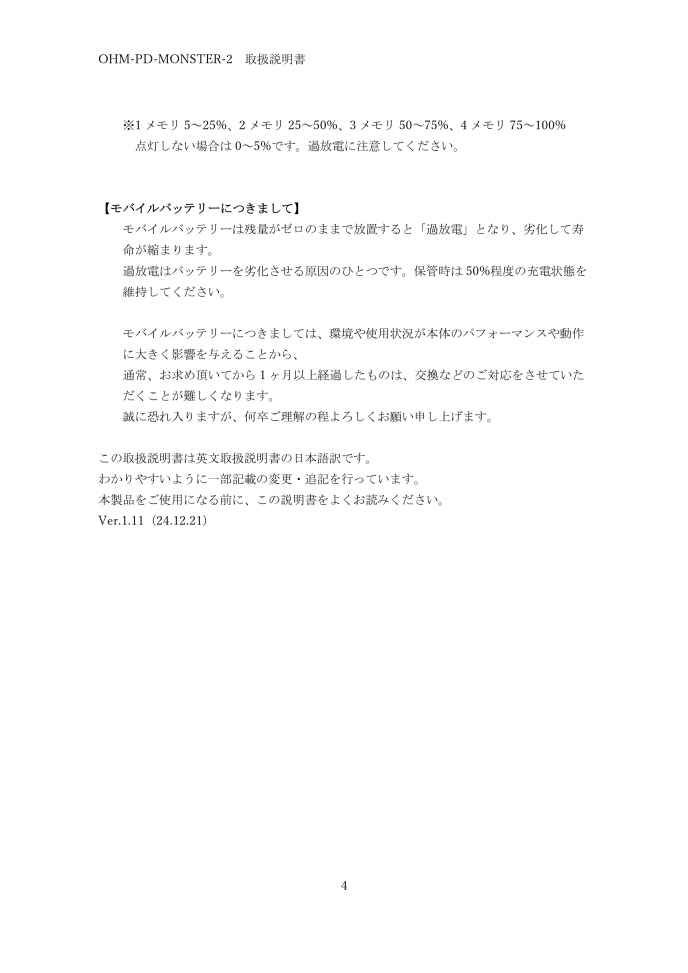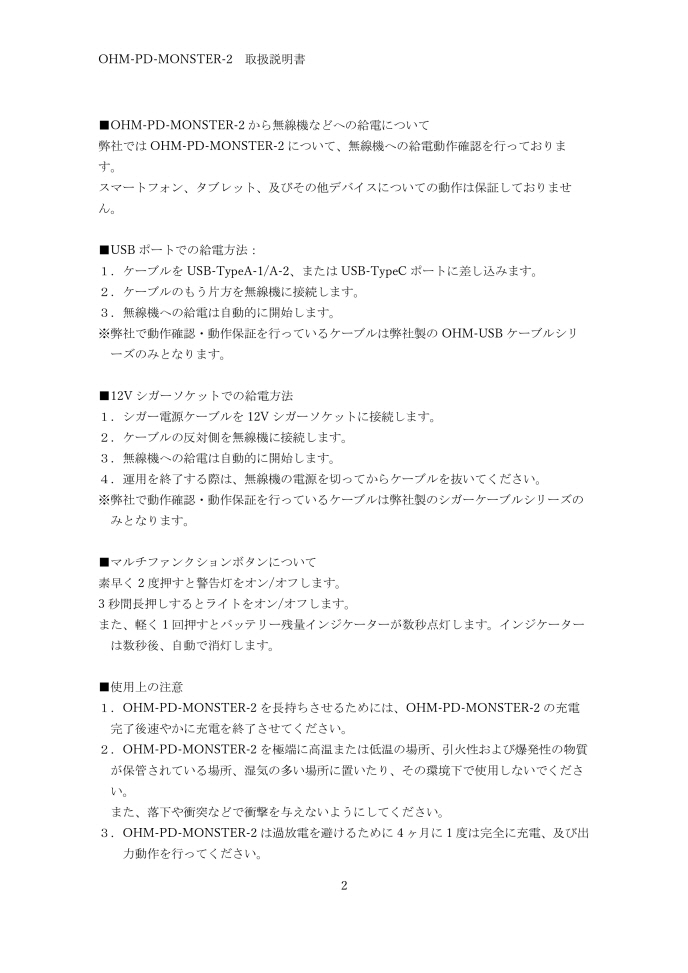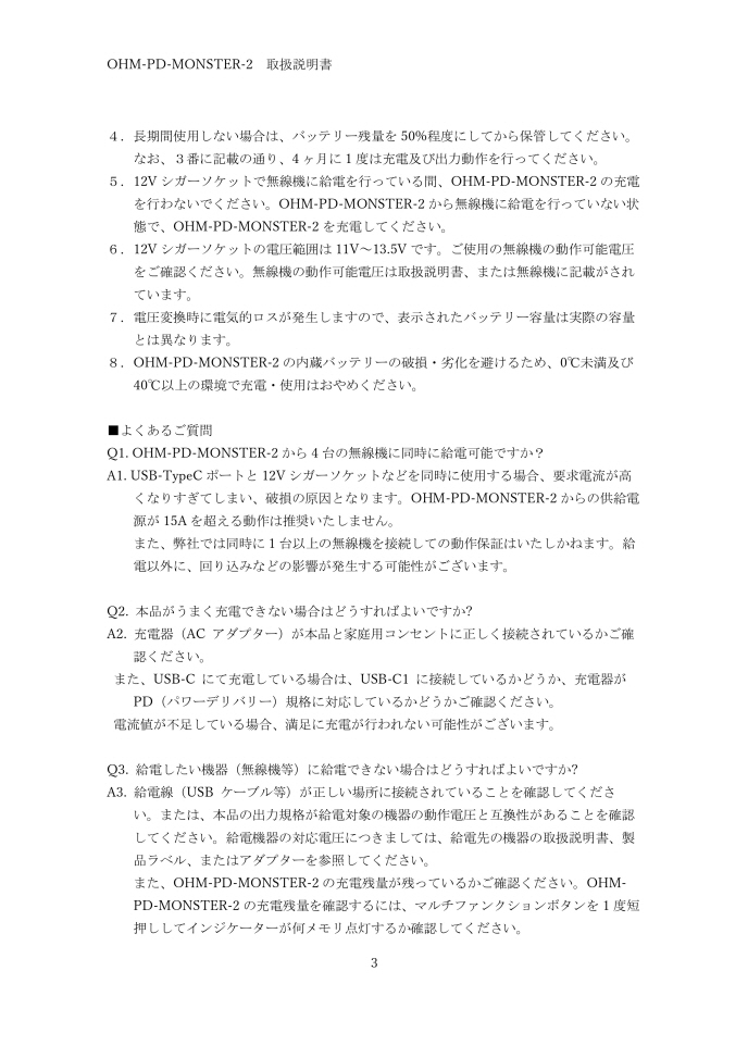 3. OHM-PD-MONSTER-2は過放電を避けるために4ヶ月に1度は完全に充電、及び出力動作を行ってください。