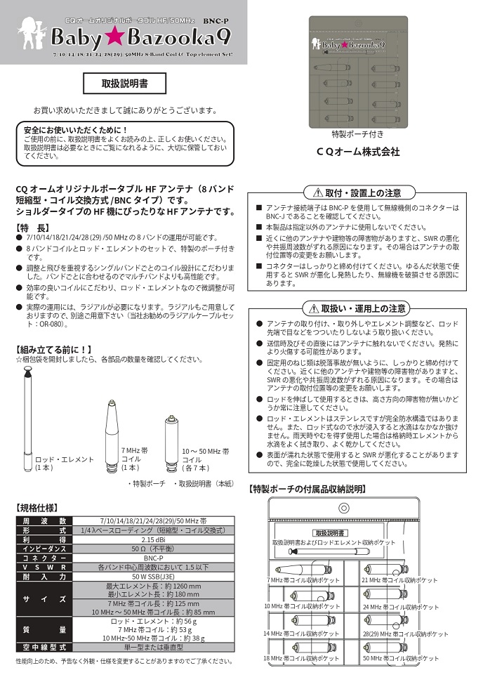7/10/14/18/21/24/28(29)/50MHzの9バンド。共通ロッドエレメントと交換式コイルを組み合わせて運用。BNC型。