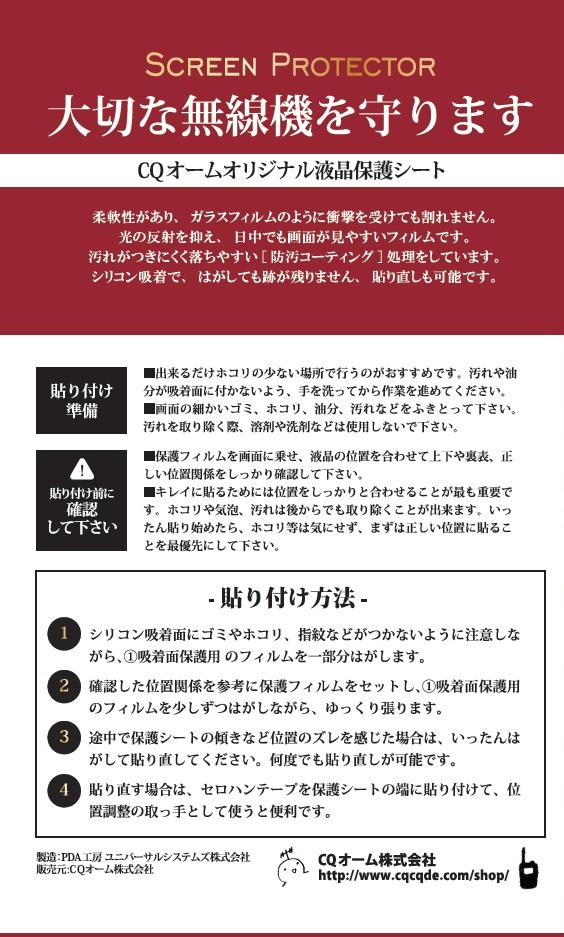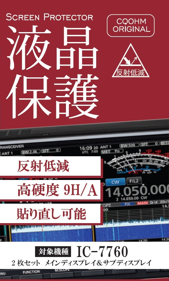 SPF-IC7760-9HA (IC7760用反射低減タイプ)CQオームオリジナル液晶保護シート 傷防止の必須アイテム。楽々貼り直しOKの最高級液晶保護シート サブ液晶用も付属。【9H/高硬度&反射低減タイプ】室内灯の反射で見づらいを防止!(SPFIC77609HA) 【対応】IC-7760用【ゆ】
