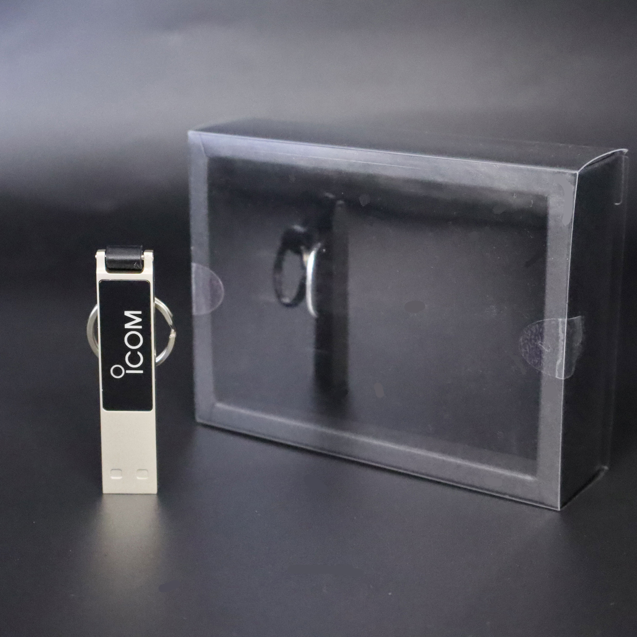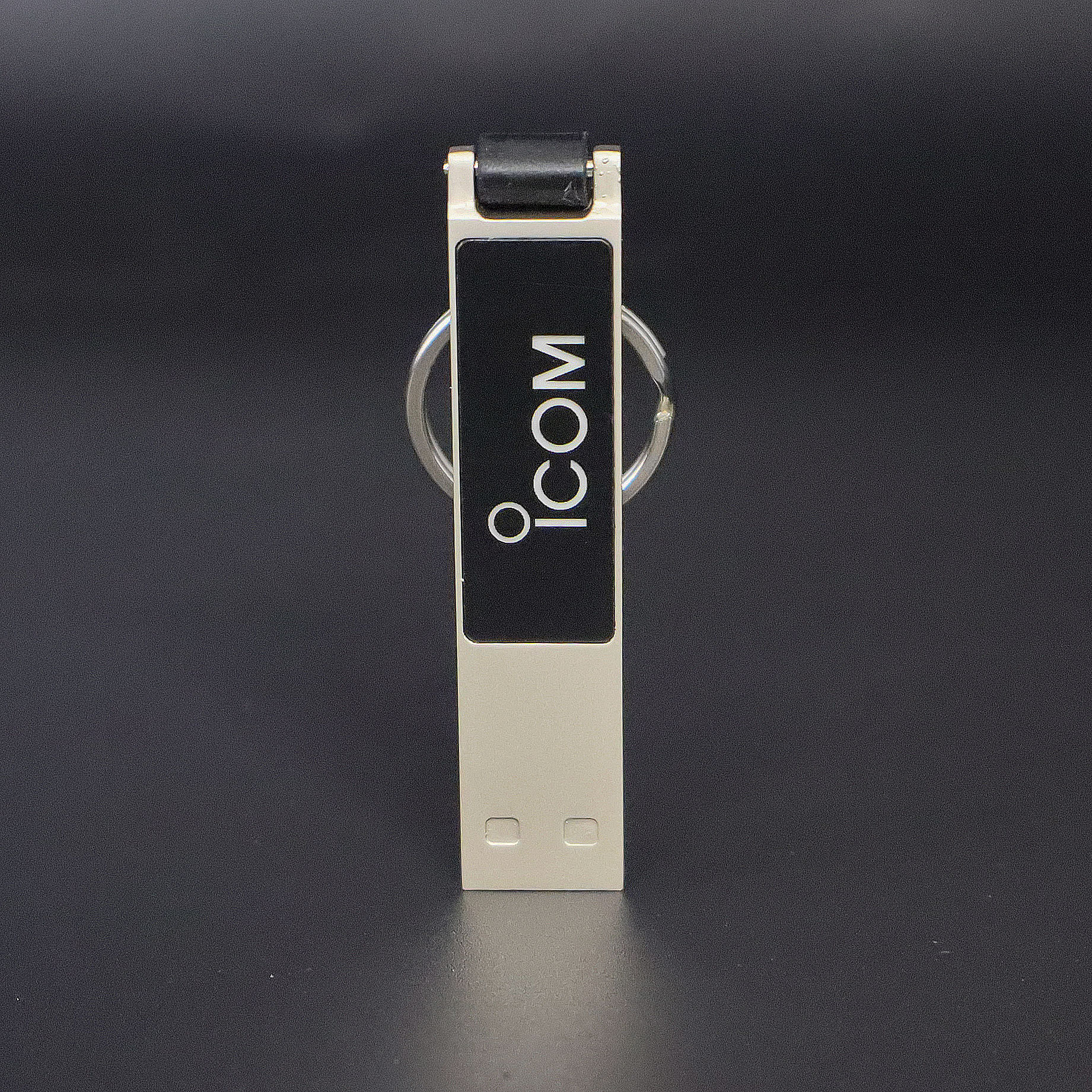 アイコムロゴが光る、ホワイトゴールド調のスリム型USBメモリです。