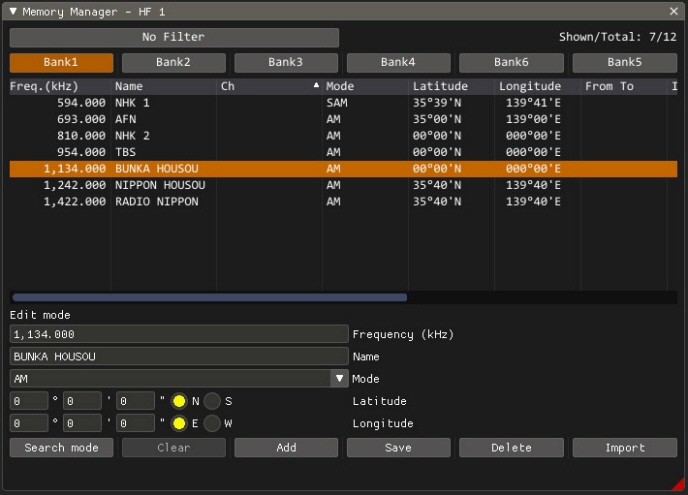 周波数、復調モード、名称、緯度経度などの情報をBANK1からBANK6まで登録することができます。 メモリーした情報はいつでも簡単に読み出すことができます。