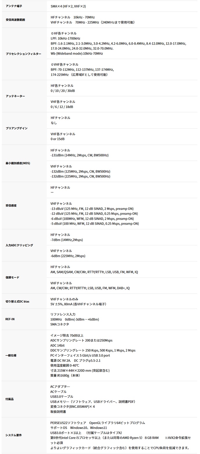 PERSEUS22(ペルセウス22) 4チャンネルダイレクトサンプリングレシーバー マイクロテレコム社(イタリア)製。ウインドウズ上で動作するソフトウェア受信機。HF(10kHz~70MHz)2ch、VHF(70~225MHz)2ch、合計4チャンネルを同時受信。帯域全体の受信データをごっそり保存していつでも復調できる最新モデル!【取り寄せ】