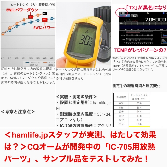購入後、Lの方をIC-705に取り付け。簡単に取り付けできました。念のため、PC用ファンでフィンに風を当てて、先日のコンテストで2時間ほどRUNしてみました。5WでCQ+呼びまわりをしてもTEMPメーターのバーが10本程度しか上がらず。(全体の3分の1程度)良く放熱しているようです。大変良い性能だと思います。次回はSタイプのヒートシンクで試してみたいと思います。