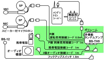 ヘルメットをかぶっている時に携帯電話が使え、タンデム会話やMD・CDなど外部入力端子に接続したオーディオを聴くことができます(別途スピーカー付マイクロホンが必要です)。さらにオプションの無線用一体型スイッチボックスを加えるとハンディトランシーバーが使用できる多機能タンデムアンプです。