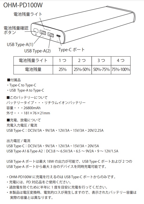 ・OHM-PD100Wに充電を行えるのはUSB Type-Cポートからのみです。