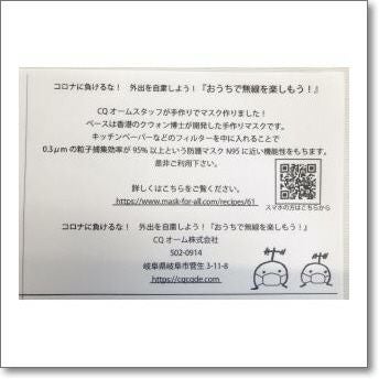 【生産終了・完売】優れもの布マスク(サイズL) CQオームスタッフ手作りオリジナル『優れモノ布マスク』を限定発売! フィルターによって医療用マスクの標準である「N95マスク」に近い機能性を発揮できます!※色柄は選べません。※一人4枚まで【ゆ】